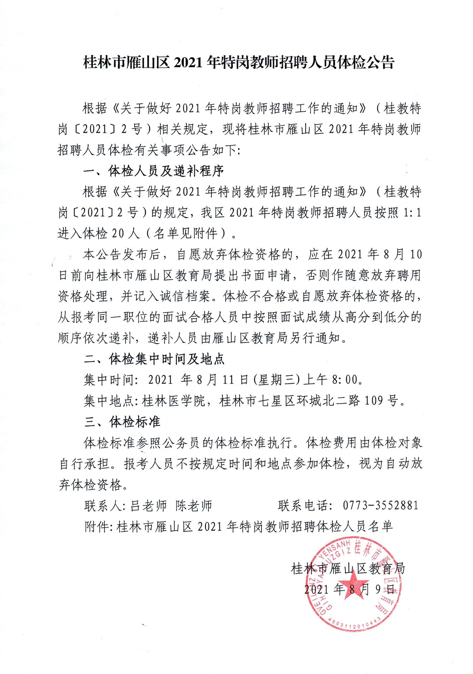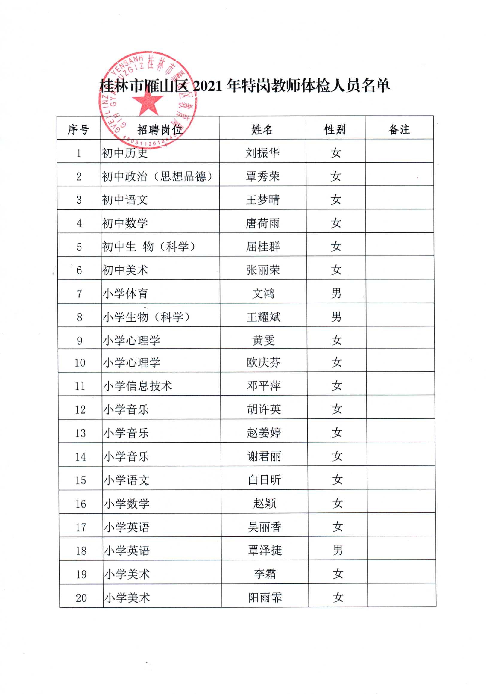 桂林市雁山区2021年特岗教师招聘人员体检公告