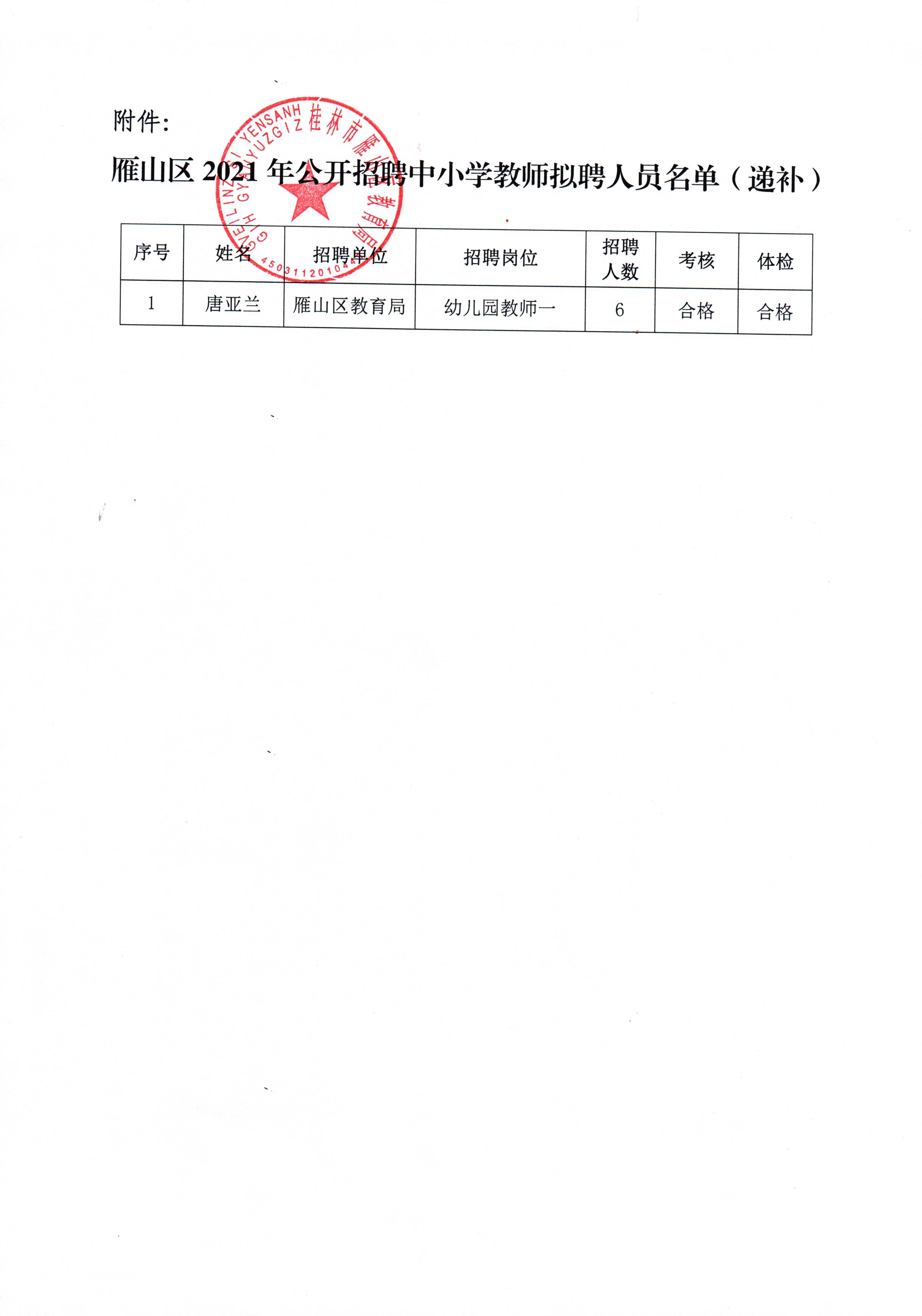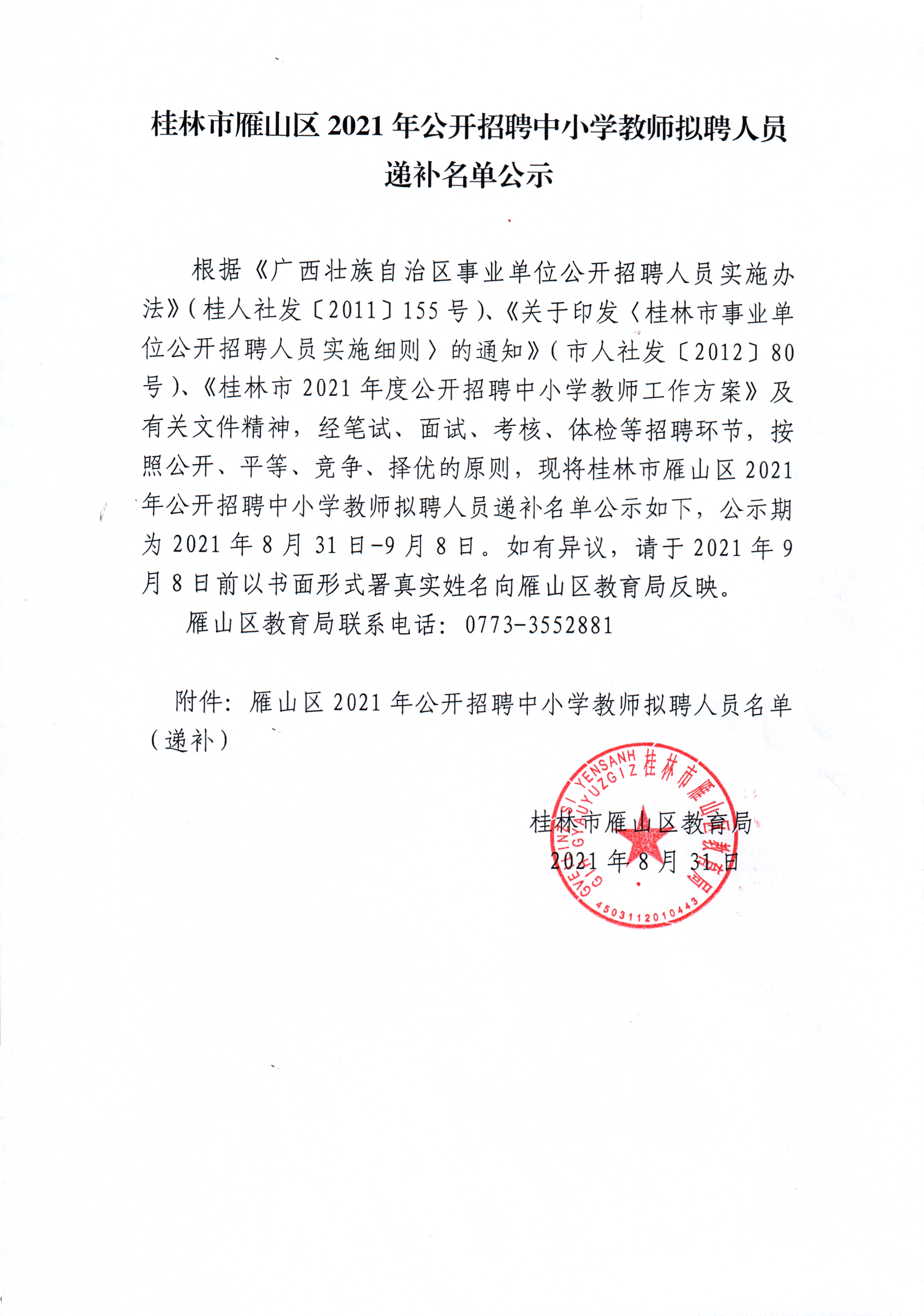桂林市雁山区2021年公开招聘中小学教师拟聘人员递补名单公示