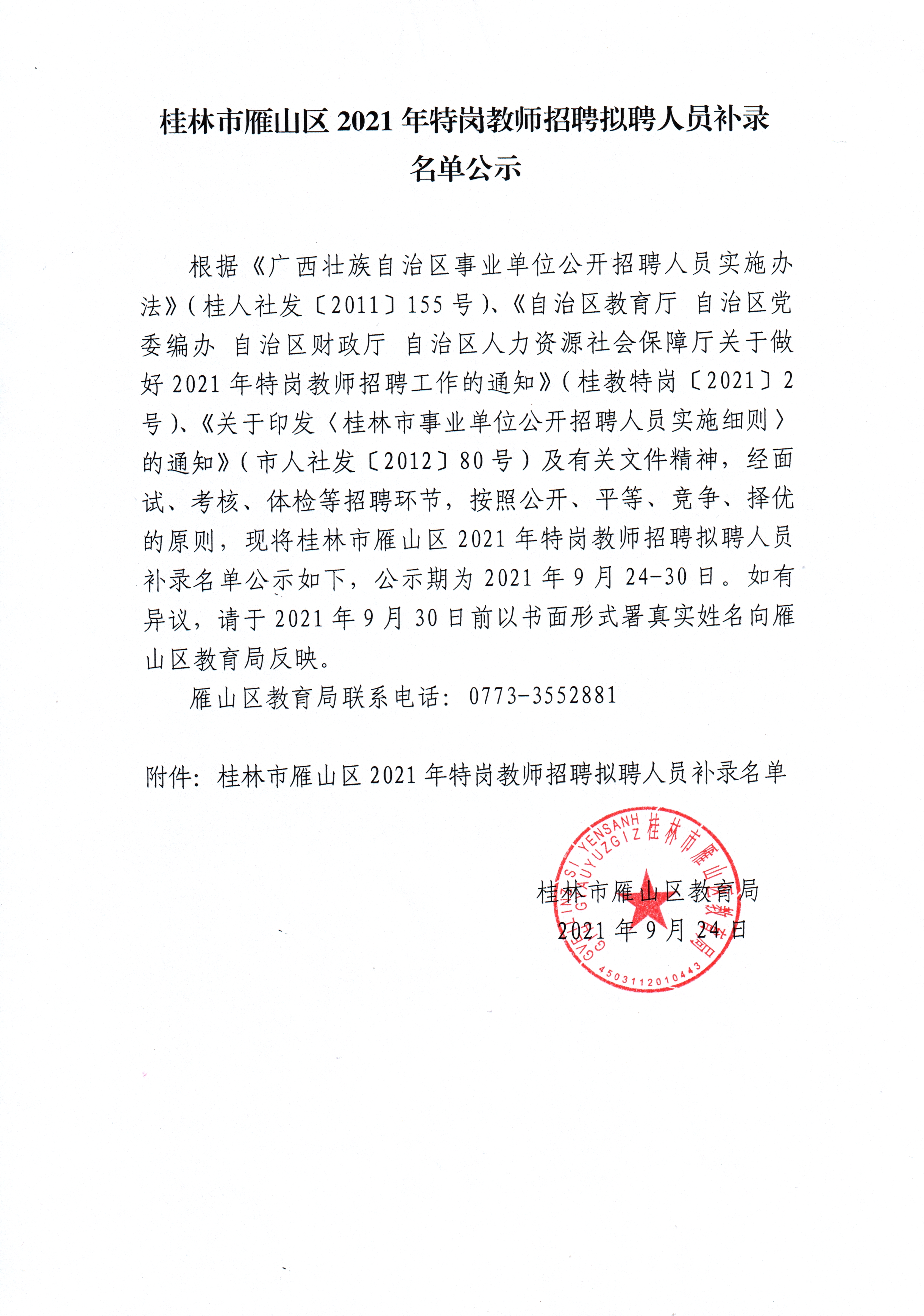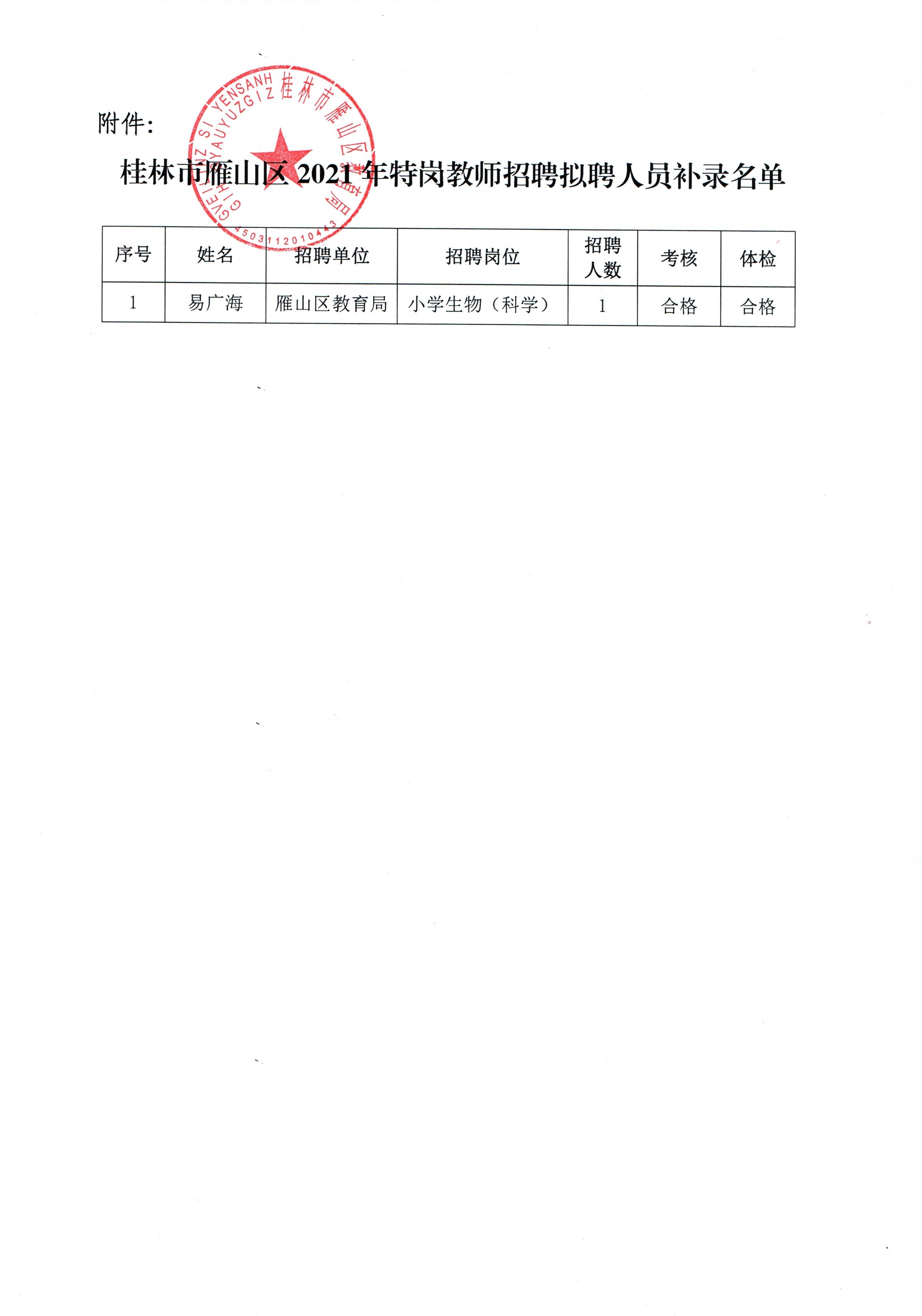桂林市雁山区2021年特岗教师招聘拟聘人员补录名单公示