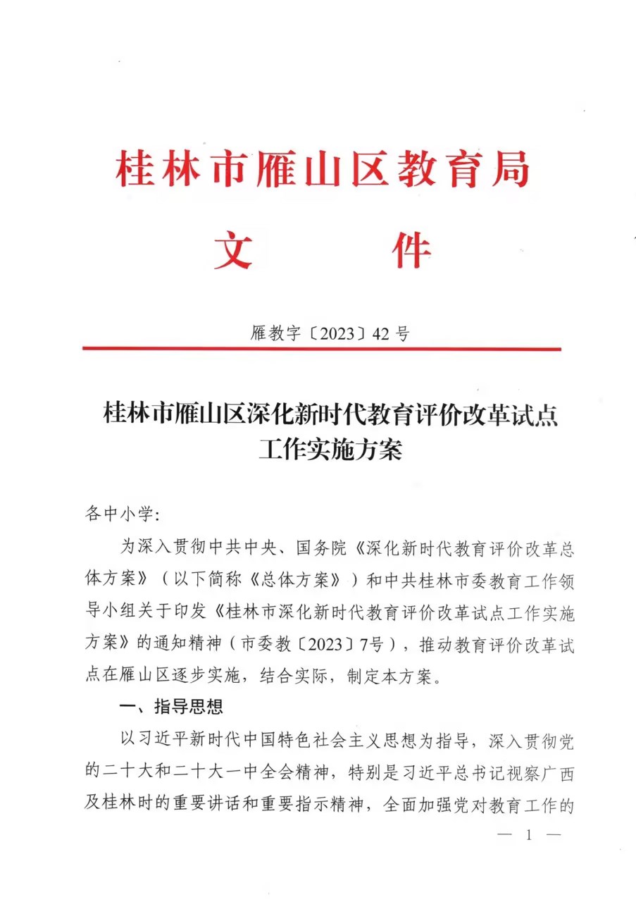 雁教字〔2023〕42号桂林市雁山区深化新时代教育评价改革试点工作实施方案