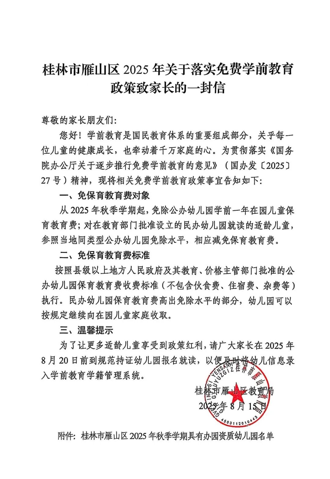 【政策】桂林市雁山区2025年关于落实免费学前教育政策致家长的一封信