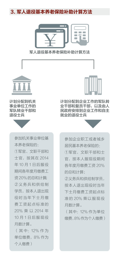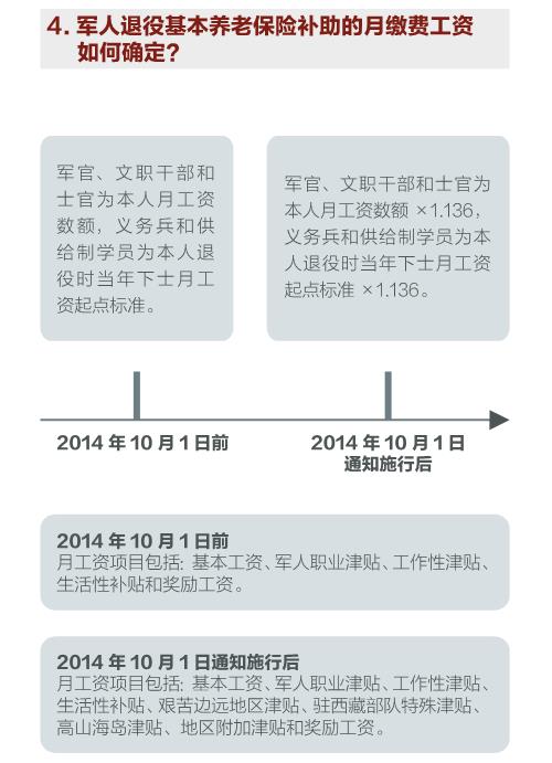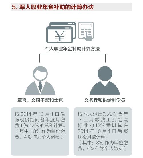 国务院、中央军委批准改革完善军人退役养老保险制度。《关于军人退役基本养老保险关系转移接续有关问题的通知》和《关于军人职业年金转移接续有关问题的通知》,明确从2014年10月1日起,军人退役参加基本养老保险的,在军人退役离开部队时,由军人所在单位财务部门一次性计算给予军人退役基本养老保险补助和军人职业年金补助,所需经费由中央财政承担。