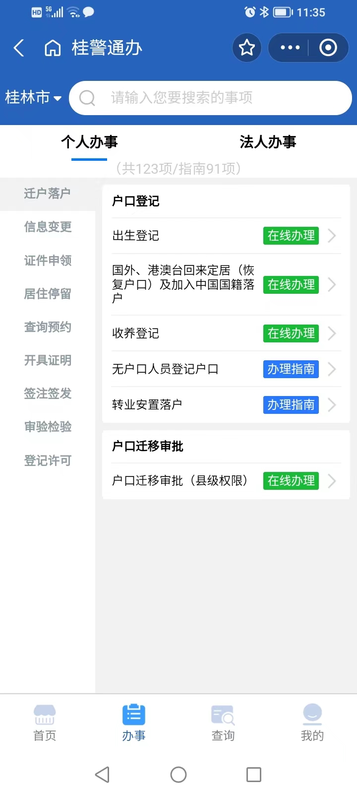 6、点击办事,然后选择国外、港澳台回来定居(恢复户口)及加入中国国籍落户