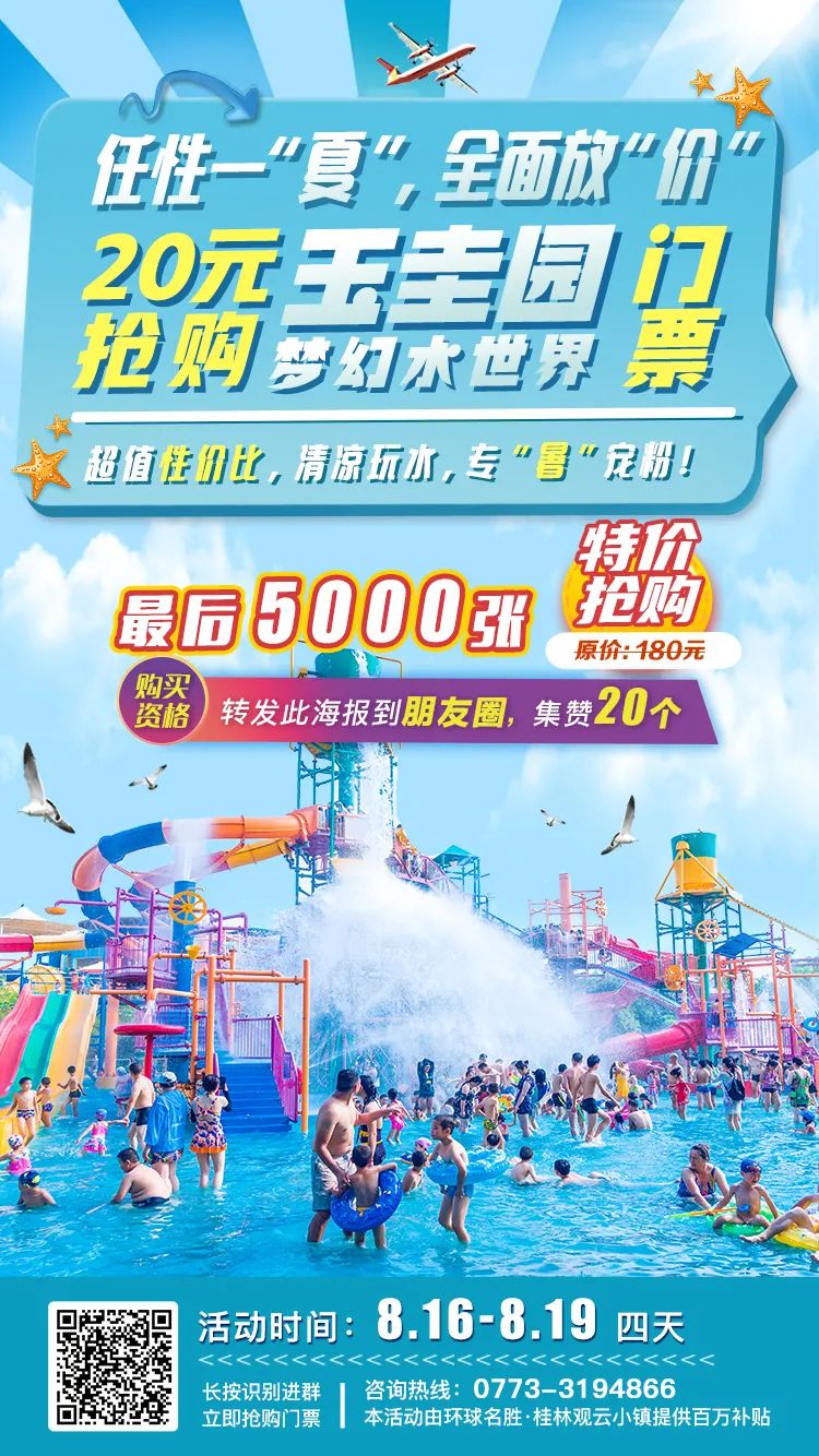 1、保存下图到相册,将图片发布到朋友圈,集赞20个,即可20元享购玉圭园水乐园门票1张(通票)。
