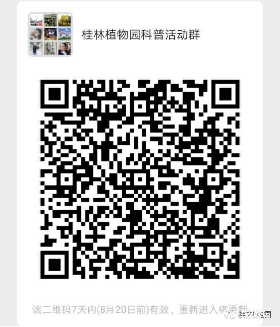 报名方式:扫描“桂林植物园科普活动群”二维码入群,发送“活动报名:学生姓名+性别+年龄+学校+身份证号码+家长电话”到群里即可,如家长陪同,还需要发送“家长姓名+性别+身份证号码”到群里才能成功报名。(注:身份证号码用于给学生和家长购买保险)