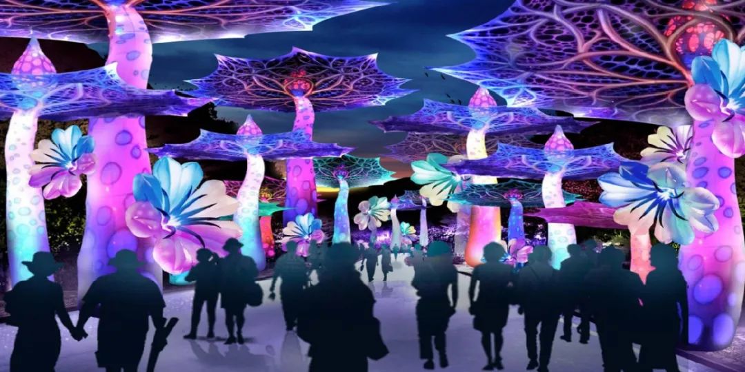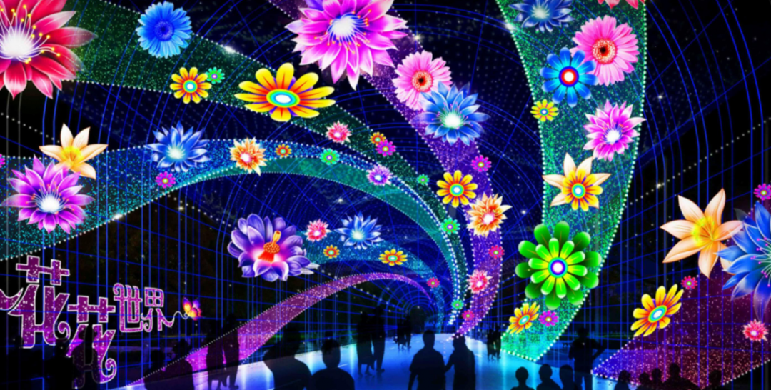 年轻人网红打卡的极光时空隧道、花花世界、奇异紫琪、合欢树灯组;