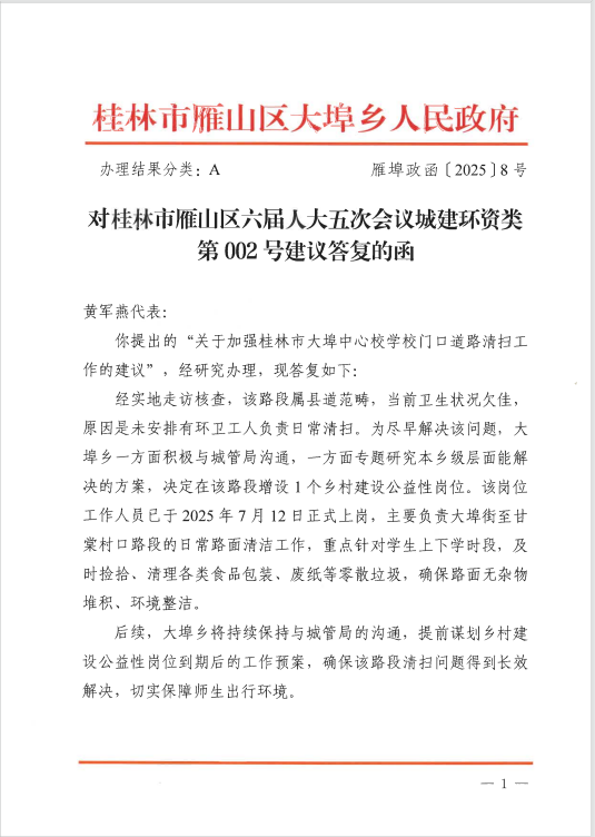 桂林市雁山区六届人大五次会议城建环资类第002号建议答复的函