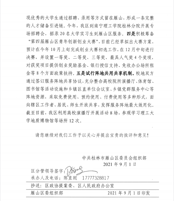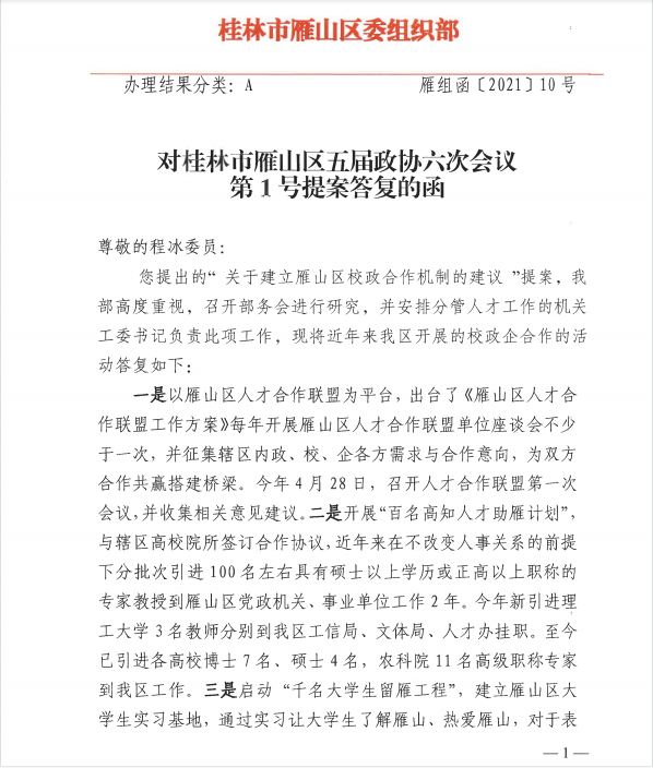对桂林市雁山区五届政协六次会议第1号提案答复的函
