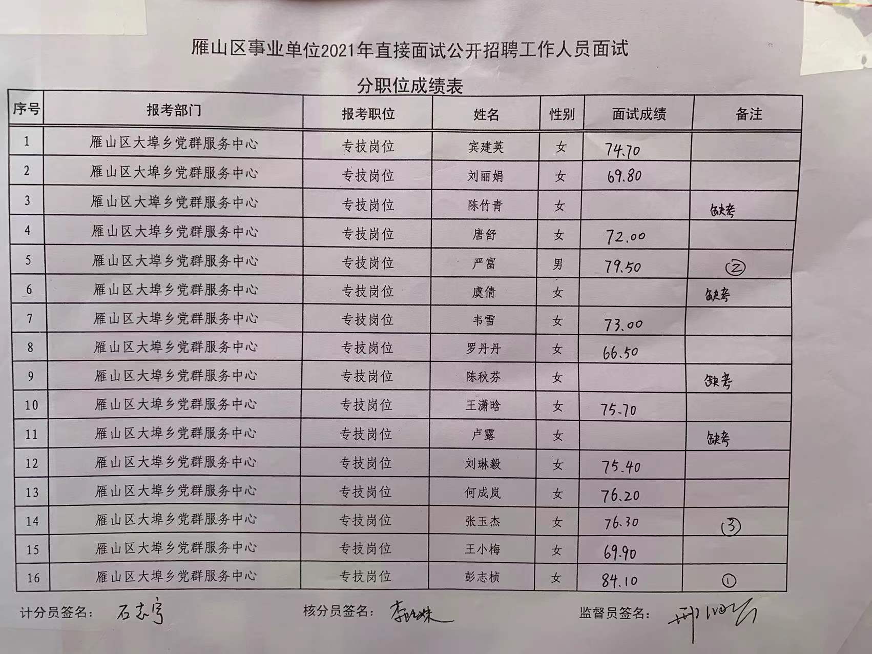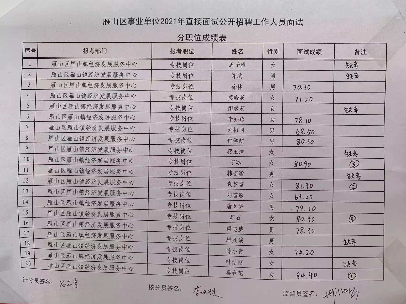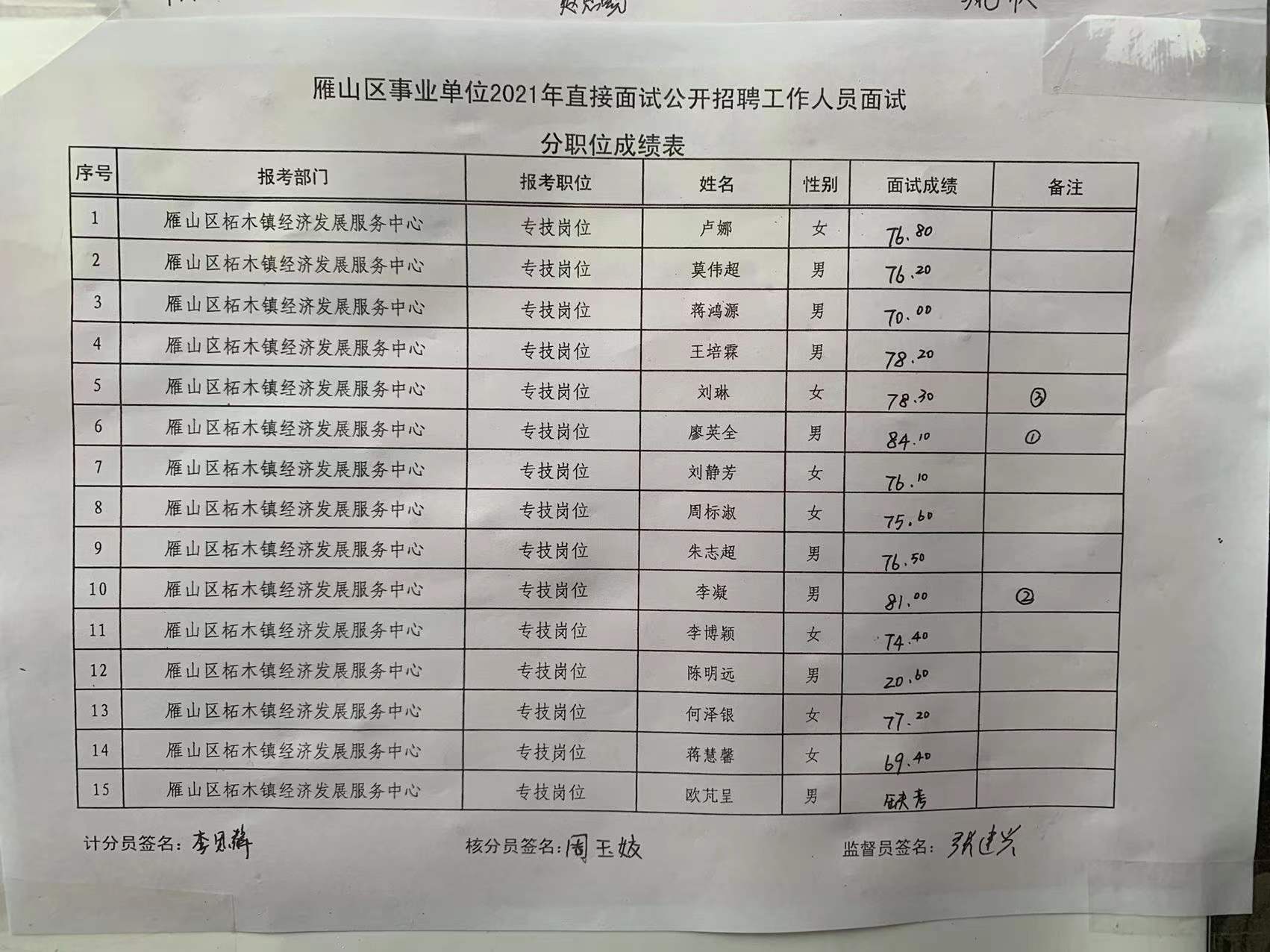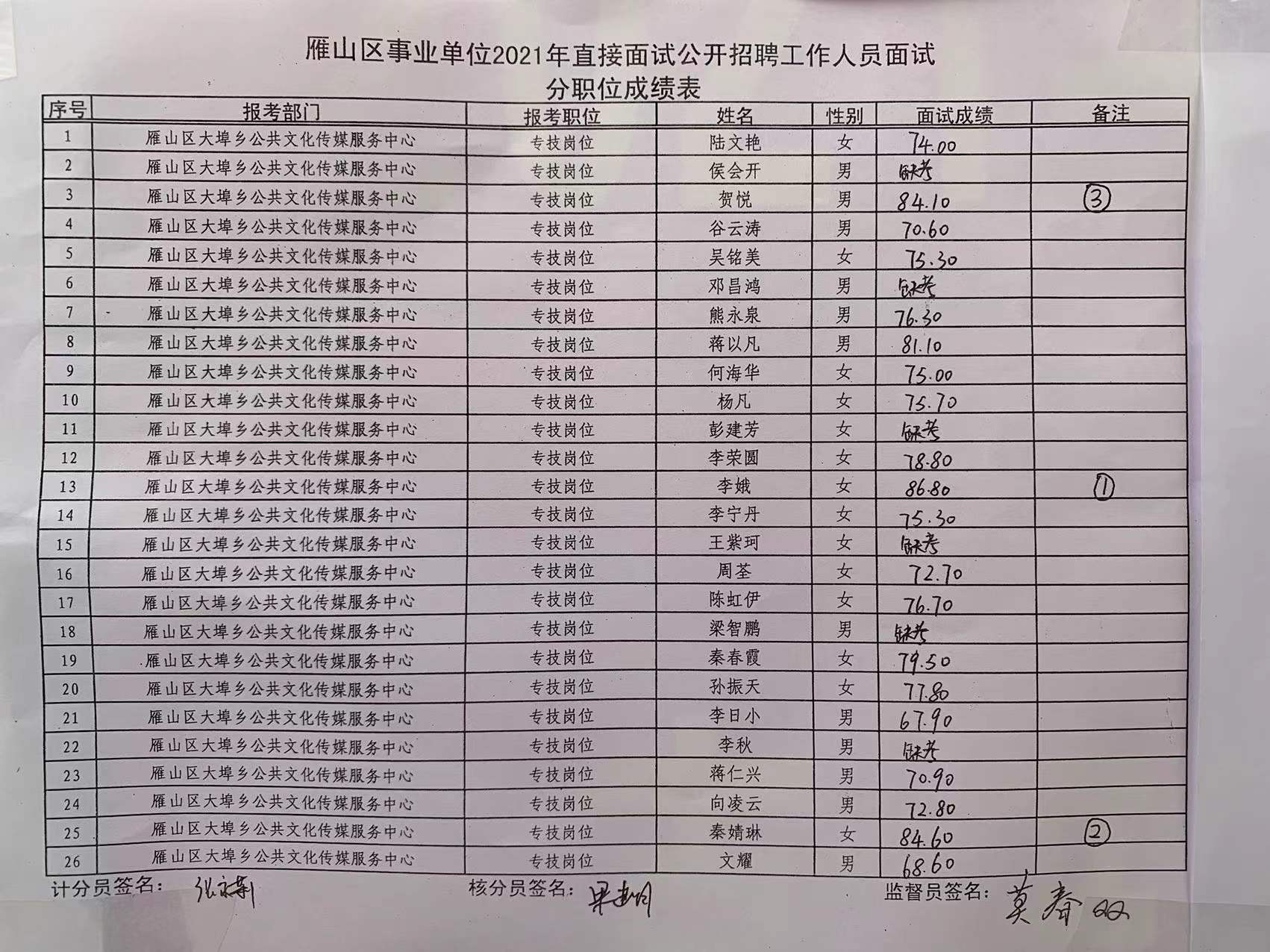 现将桂林市雁山区事业单位2021年直接面试成绩公示如下,公示期为7天。如有异议,请于2022年1月4日前,以书面形式署真实姓名向雁山区人社局反映。联系电话:0773-3553019。