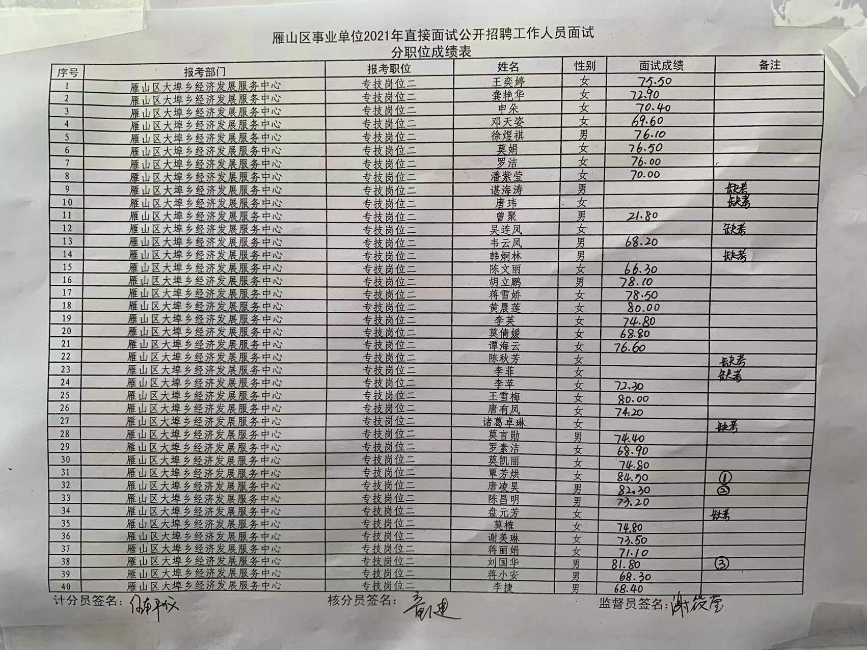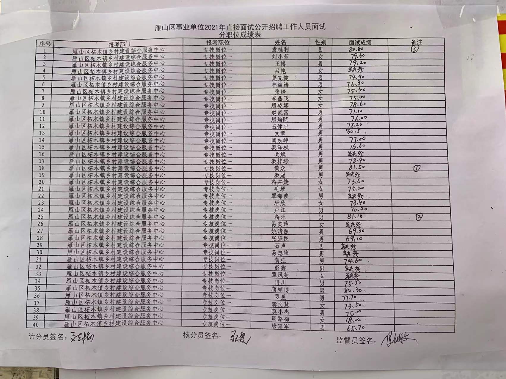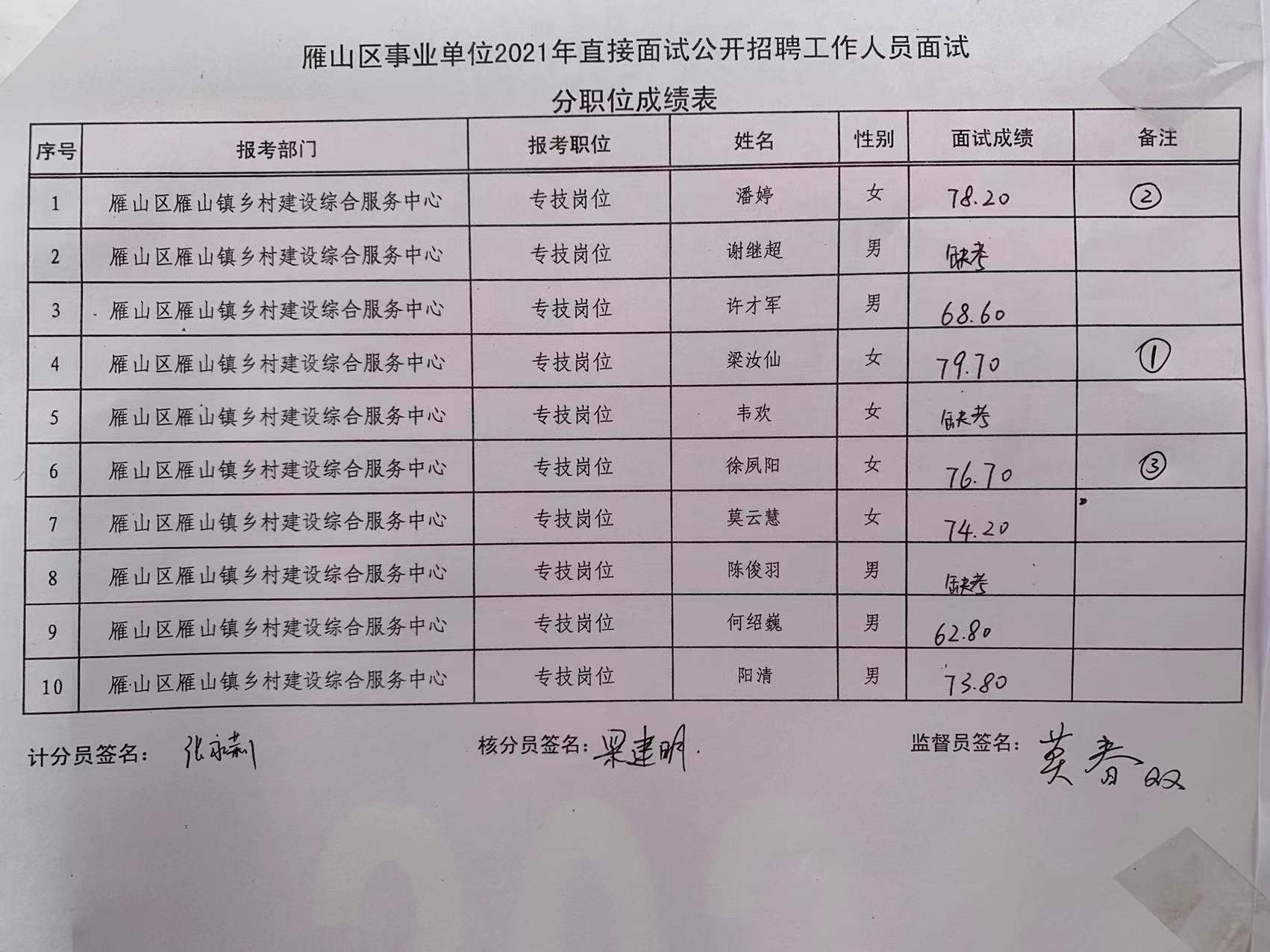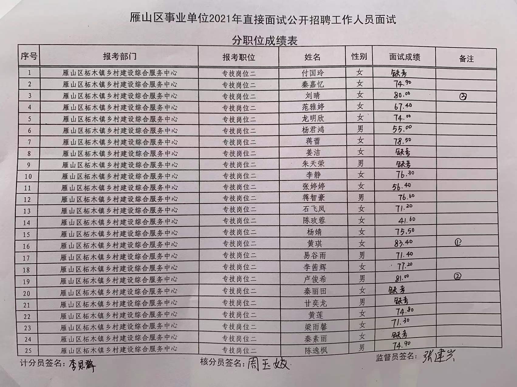 现将桂林市雁山区事业单位2021年直接面试成绩公示如下,公示期为7天。如有异议,请于2022年1月4日前,以书面形式署真实姓名向雁山区人社局反映。联系电话:0773-3553019。