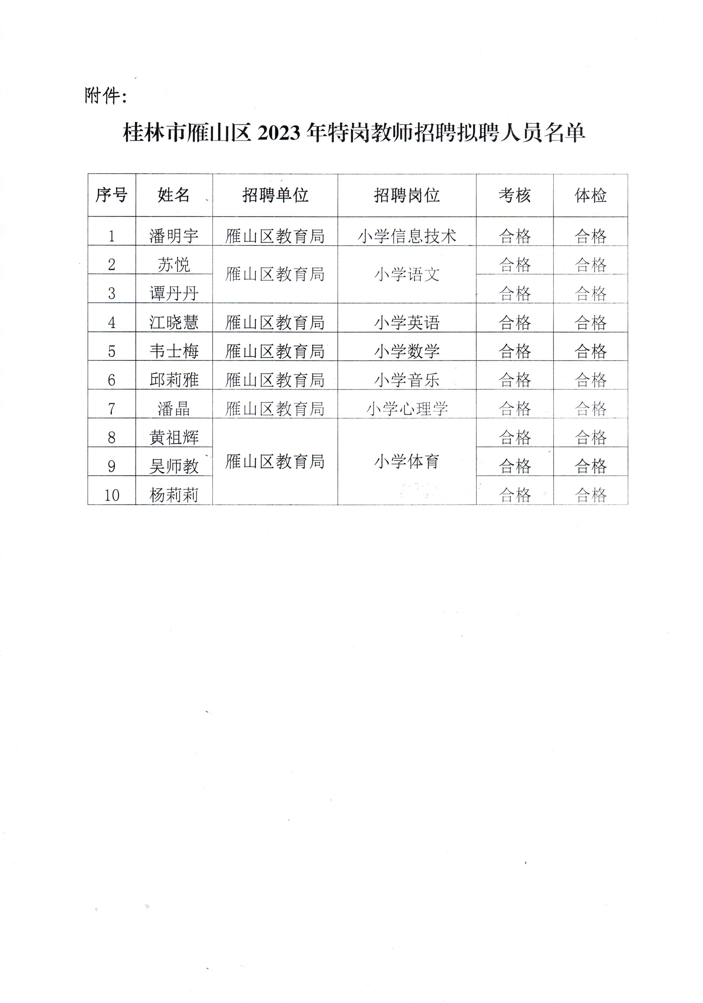 桂林市雁山区2023年特岗教师招聘拟聘人员名单公示