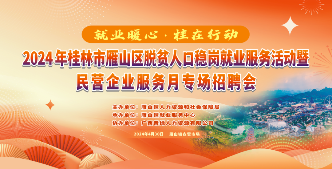 为全面贯彻党的二十大精神,坚决贯彻落实党中央、国务院关于就业工作的决策部署,集中帮扶脱贫劳动力等重点群体就业创业,促进脱贫人口就业增收,根据《广西壮族自治区人力资源和社会保障厅 广西壮族自治区农业农村厅关于做好2024年脱贫人口就业帮扶工作的通知》、《自治区人力资源和社会保障厅、发展和改革委、农业农村厅、乡村振兴局关于印发广西壮族自治区防止返贫就业攻坚行动实施方案的通知》(桂人社发〔2023〕78号)及《人力资源社会保障部等6部门关于开展2024年全国民营企业服务月活动的通知》(桂人社部函〔2024〕23号)精神,结合雁山区实际用工情况,定于2024年4月30日在雁山镇举办2024年桂林市雁山区脱贫人口稳岗就业服务活动暨民营企业服务月专场招聘会。