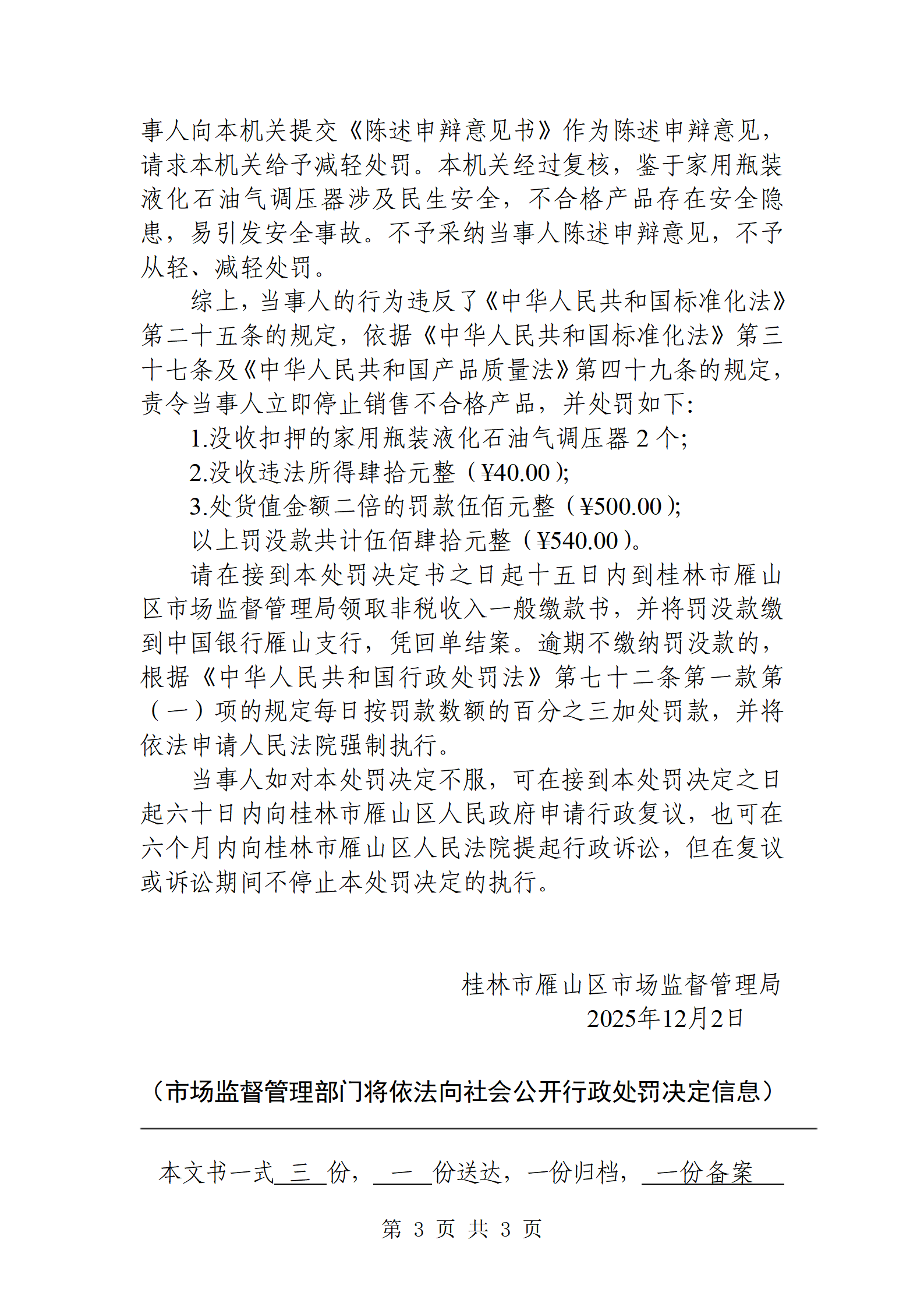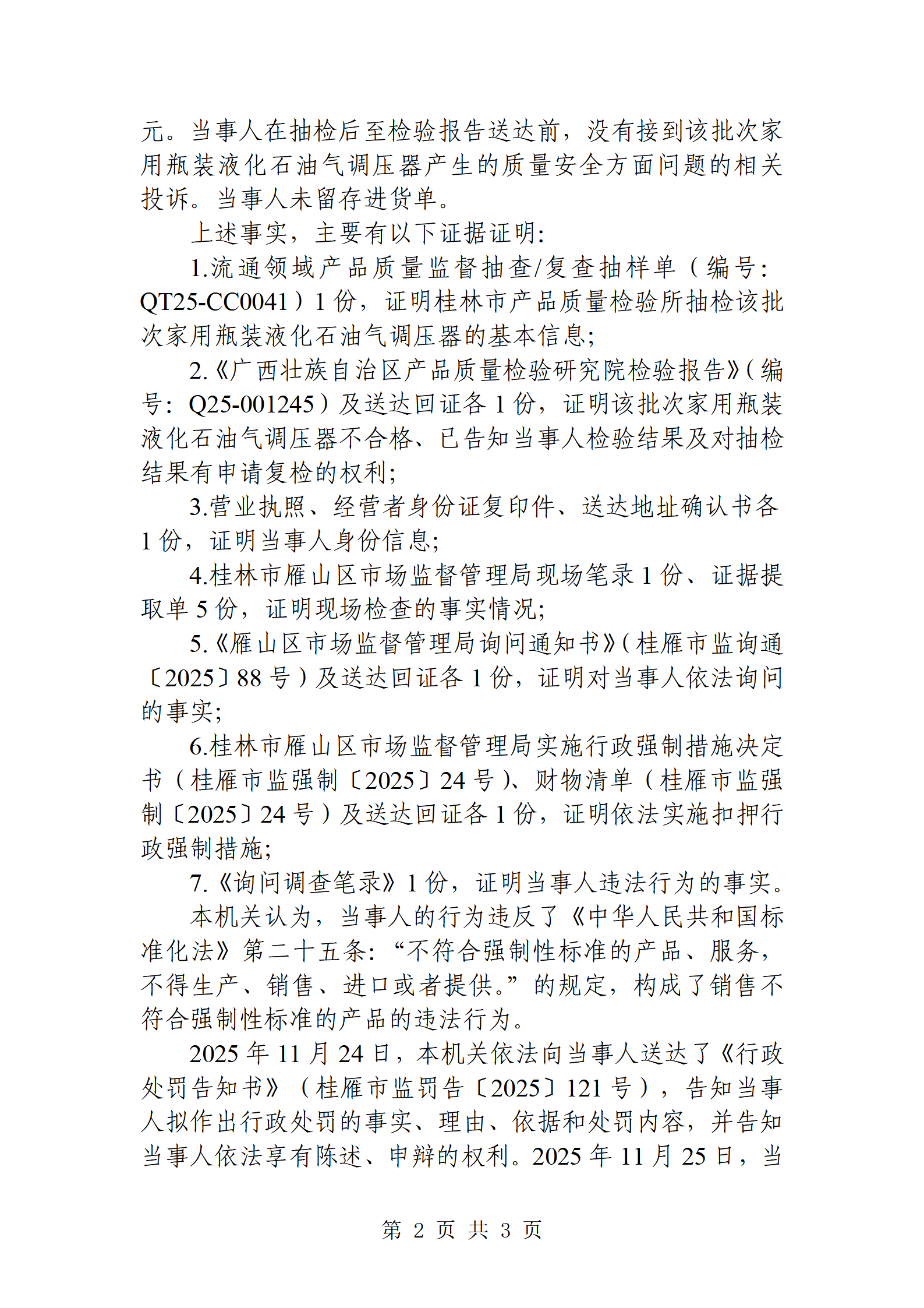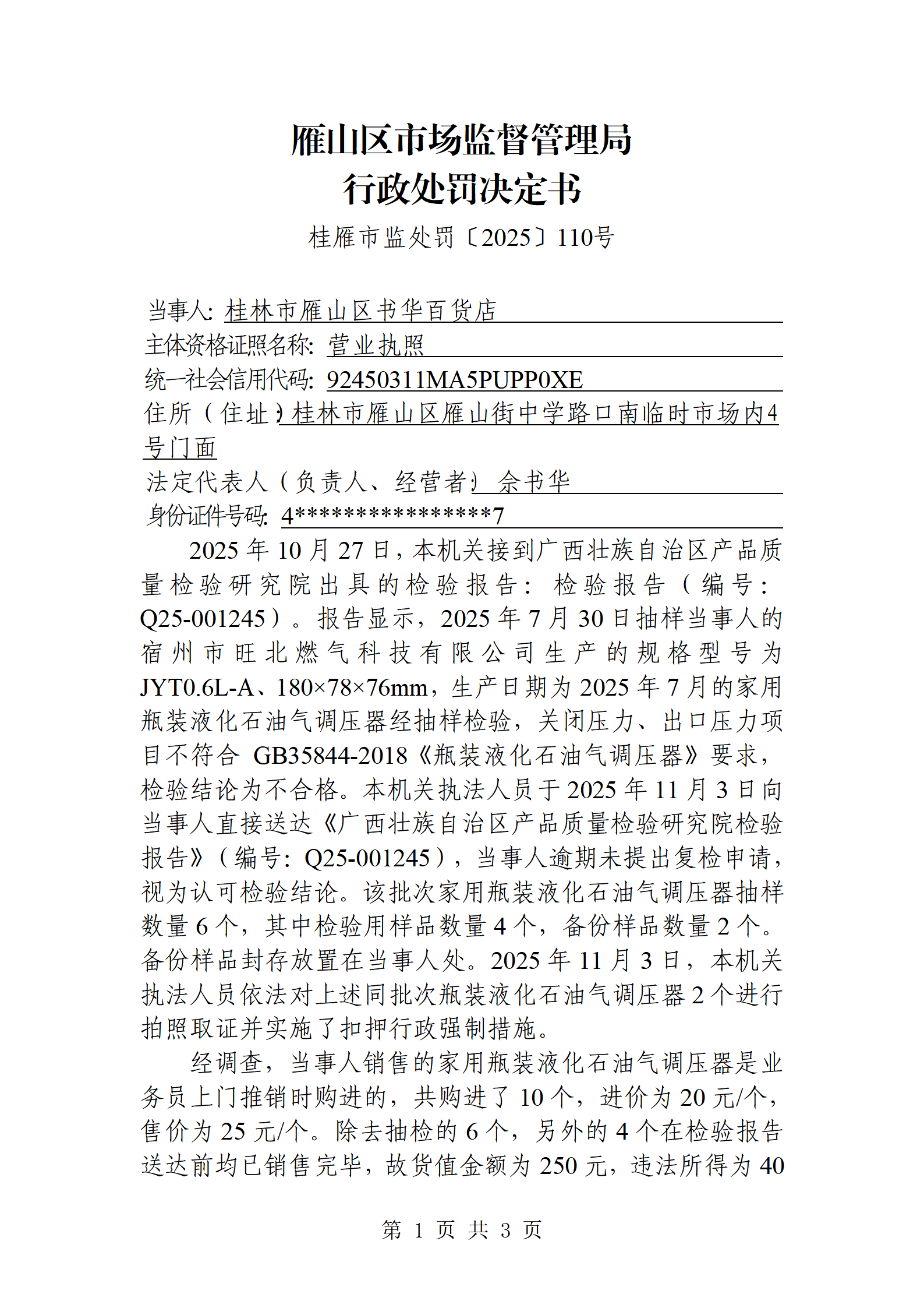 桂林市雁山区市场监督管理局行政处罚结果公告20251202