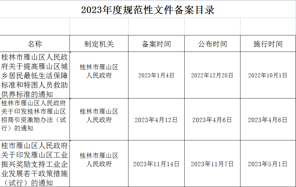 一、备案工作情况。截至目前,今年共收到区政府的备案报告3项,分别为《桂林市雁山区人民政府关于提高雁山区城乡居民最低生活保障标准和特困人员救助供养标准的通知》、《桂林市雁山区人民政府关于印发桂林市雁山区招商引资激励办法(试行)的通知》、《桂林市雁山区人民政府关于印发雁山区工业振兴支持工业企业发展若干政策措施(施行)的通知》。