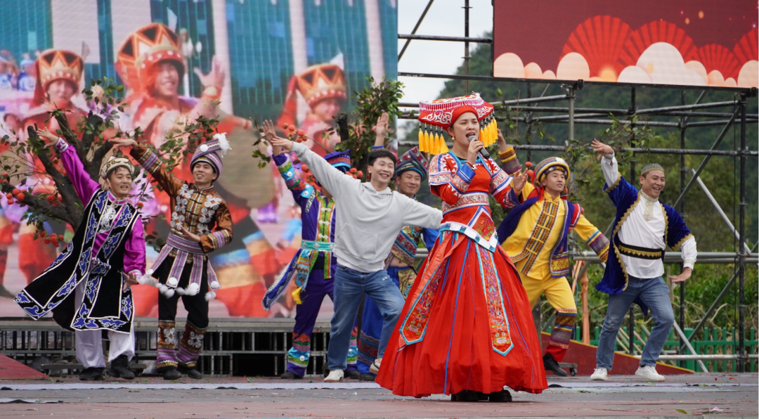 欢声笑语颂幸福,载歌载舞庆佳节。庆祝大会上,各族群众还带来了精彩的文艺演出。文艺演出分《好客草坪》《秀美草坪》《奋进草坪》三个篇章。舞蹈《背篓绣球》生动展现了草坪回族乡传统民族活动的热闹场景,《漓水溶月影》仿佛将“青罗带上的一颗明珠”带到了观众眼前,优美的舞姿与灵动的音乐完美融合,展现了草坪回族乡如诗如画的自然风光和深厚的文化底蕴。演出尾声,各族人民群众齐欢唱《中华民族一家亲》,现场气氛欢乐祥和。歌声中,人们手牵手、心连心,共同表达着对民族团结和美好生活的祝愿。
