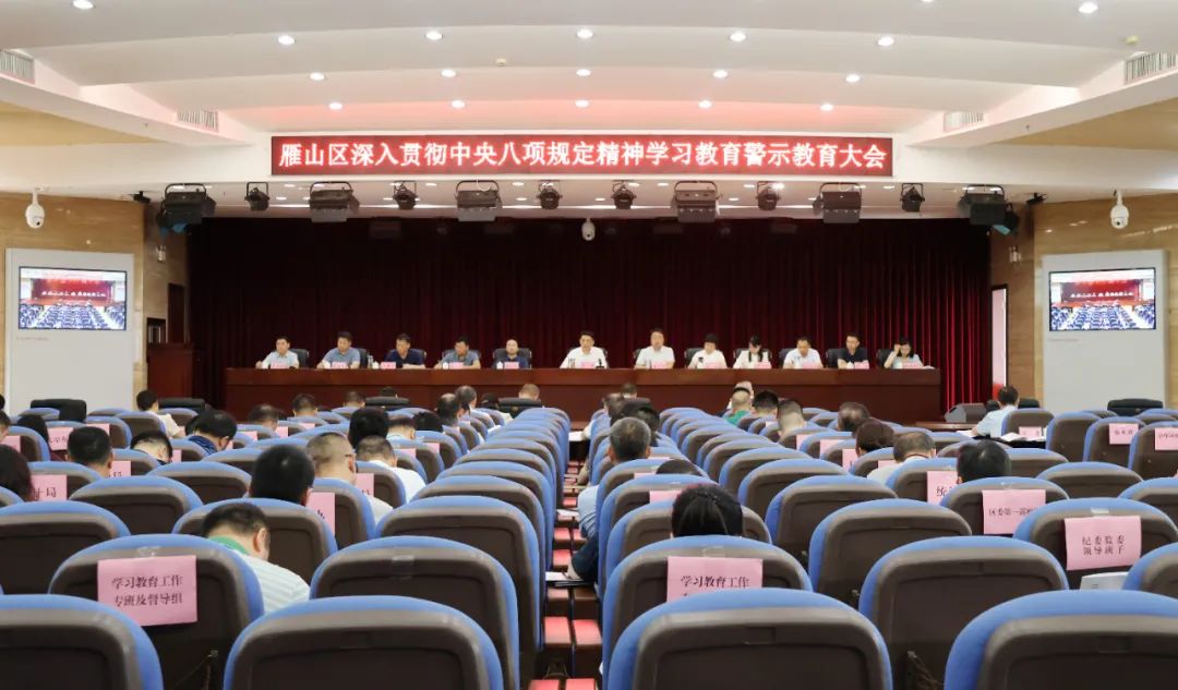 6月20日,雁山区深入贯彻中央八项规定精神学习教育警示教育大会举行,全面贯彻习近平总书记关于加强党的作风建设的重要论述、关于深入贯彻中央八项规定精神学习教育的重要讲话和重要指示精神,以案为镜鉴,结合近年来桂林市查处的违反中央八项规定精神典型案例深入剖析,以案说德、以案说纪、以案说法、以案说责,教育引导广大领导干部深刻汲取教训、反躬自省、正己修身,坚决守好政治生态、自然生态“两个生态”。区委书记李强主持会议并讲话。区长潘军华、区人大常委会主任蒋桂斌、区政协主席李红出席会议。