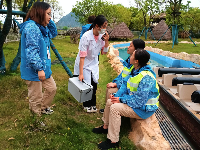 医护人员模拟检查游客受伤情况