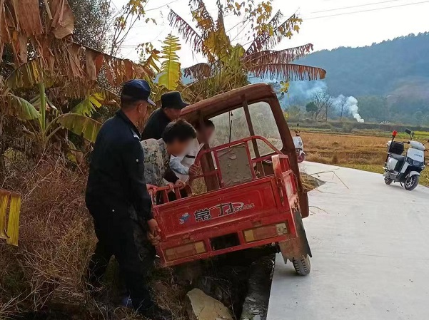 近日,大埠派出所辅警朱方五巡逻时发现,一辆三轮车掉进村道路边沟内,无法继续行驶,一名老人在现场一筹莫展。朱方五见状,立即将巡逻车停在路边,上前询问情况。经了解得知,车主因操作不当,导致车辆掉落在路肩外,差点造成车辆侧翻,期间自己多次尝试都没能将车开上路面。