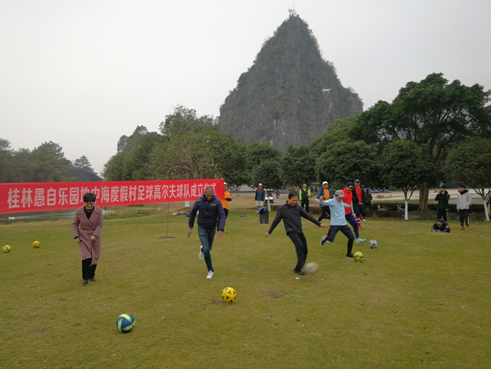 12月18日,由愚自乐园地中海度假村牵头组织,中国足球高尔夫协会会长晆冰一行到愚自乐园对足球高尔夫项目进行宣传、指导和推广。市体育局副局长莫智斌、区委宣传部长李红、区文体旅游局局长莫一溪、主任科员马谢庆参加此次活动。活动由三个部分组成。第一部分,邀请了师大、理工大共4名足球运动员参与足球高尔夫体验示范赛。第二部分,由中国足高协会、愚自乐园度假村对足高项目进行宣讲。第三部分,邀请市体育局和区文体局领导参加愚自乐园地中海度假村足球高尔夫球队成立仪式,并开首球。