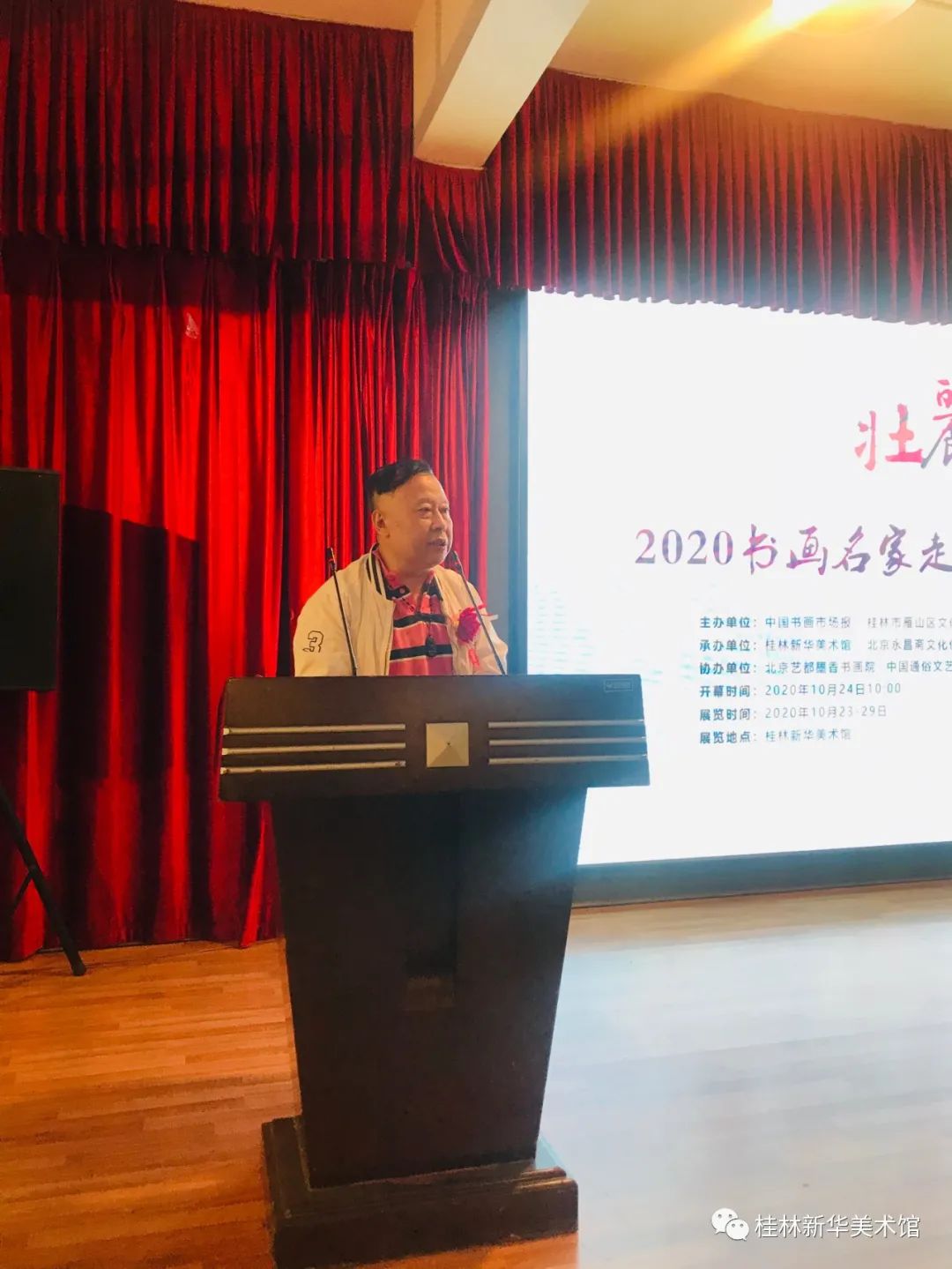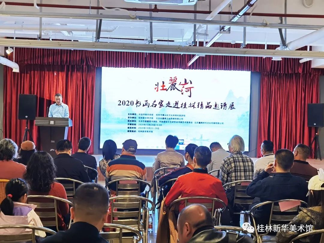 2020年10月24日10时,由中国书画市场报、桂林市雁山区文化体育和旅游局主办,桂林新华美术馆 、北京永昌斋文化传媒有限公司承办、北京艺都墨香书画院、中国通俗文艺研究会书画艺术委员会、北京鑫辉时代文化传媒有限公司协办的“壮丽山河—2020书画名家走进桂林精品邀请展”在桂林市新华美术馆隆重开幕,参加开幕式的领导及嘉宾有: