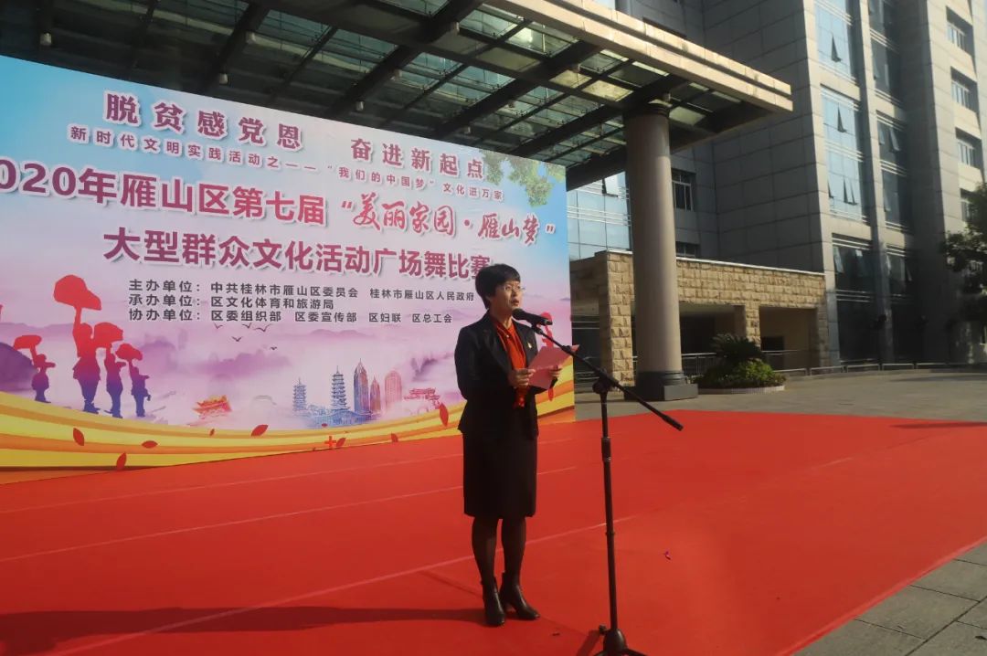 “美丽家园·雁山梦”大型群众文化活动系列之广场舞大赛的成功举办是雁山区广大干部群众精神文化生活日益丰富的生动体现,要赛出成绩、赛出风彩、赛出强大正能量,进一步加快文化强区步伐,推进我区文化大发展大繁荣。
