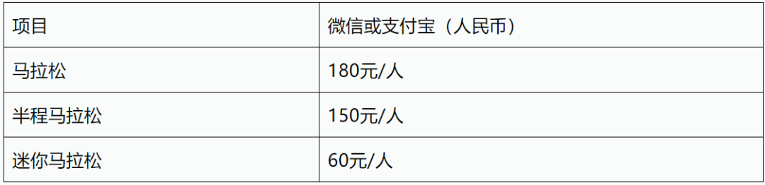 *马拉松及半程马拉松报名费中含一次性计时芯片费用、参赛服装、奖牌、赛时补给、保险等费用;迷你马拉松报名费中含参赛服装、奖牌、赛时补给、保险等费用*