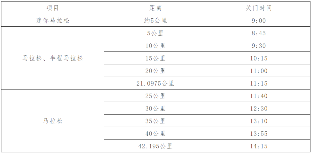 关门时间按自然时间计算,具体见下表(按上午8:00鸣枪起跑)