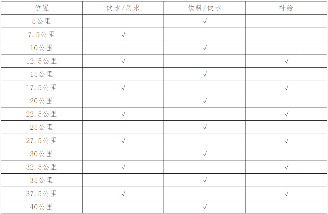 2.能量补给站:在比赛沿途的12.5公里、17.5公里、22.5公里、27.5公里、32.5公里、35公里、37.5公里以及全半程终点处设置能量补给站。