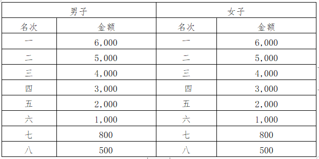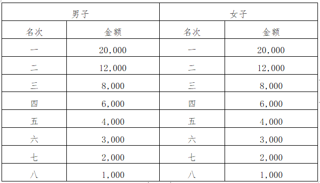 名次奖:奖励半程马拉松男、女第一至八名,其中第一至三名获奖选手以枪声成绩录取,第四至八名以净计时成绩录取,奖金见下表(人民币,单位:元)