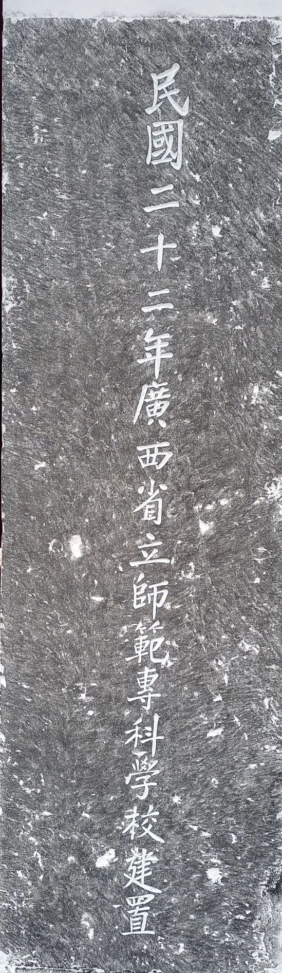 在雁山园碧云湖北边有一栋方长高大的楼房,楼脚基石刻有 “民国二十二年广西省立师范专科学校建置”的一行字,字体庄重稳健,几无烟火之味。碑高170厘米,宽55厘米。此楼为广西省立师专首任校长杨东纯所建。