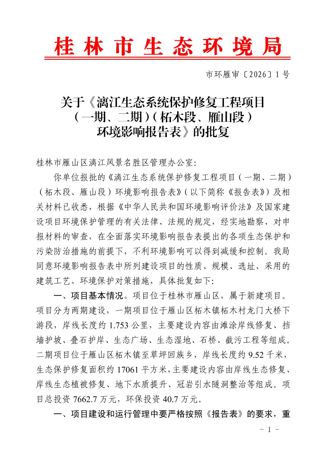 桂林市雁山生态环境局关于对《漓江生态系统保护修复工程项目(一期、二期)(柘木段、雁山段)》的批复的公示