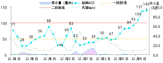 2023年12月各空气站点平均风速为1.8m/s(上月1.4m/s),平均降水量为0.7mm(上月1.5mm),平均湿度为55.8%(上月58.1%),平均温度12.0℃(上月18.3℃)。12月桂林市气温有所下降,降水量较少,12月底扩散条件较差,出现3天轻度污染天气。图2为AQI与气象参数变化趋势图。