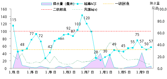 2024年1月各空气站点平均风速为1.6m/s(上月1.8m/s),平均降水量为6.2mm(上月0.7mm),平均湿度为55.8%(上月52.3%),平均温度10.5℃(上月12.0℃)。1月桂林市气温稳定,冷空气活动较弱,颗粒物浓度较高,空气质量偏差,以良到轻度污染为主。图2为AQI与气象参数变化趋势图。
