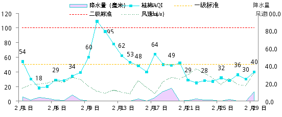 20242月各空气站点平均风速为2.0m/s(上月1.6m/s),平均降水量为1.9mm(上月6.2mm),平均湿度为65.4%(上月55.8%),平均温度9.6℃(上月10.5℃)。2月桂林市受冷空气影响气温有所下降,降水量较多,扩散条件较好,受春节燃放烟花爆竹影响,出现1天轻度污染天气。图2AQI与气象参数变化趋势图。