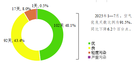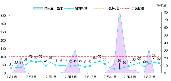 20257月桂林市城市环境空气质量指数(AQI指数)范围为2573,空气质量优的天数为18天,良13天,空气质量优良天数比例为100%,与去年同期一致。20251—7月,桂林市空气质量优良天数比例为91.5%,同比下降6.2个百分点。