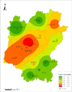20251—7月桂林市环境空气质量综合指数分布见图4。桂林市城区站点综合指数最高的是环湖路276号和秀峰区政府,最低的是林科所;PM2.5浓度最高的是环湖路276号,最低的是林科所。桂林市各县级站点综合指数最高的是灵川县下窑,最低的是龙胜县环保局;PM2.5浓度最高的是灵川县下窑和全州县城区站,最低的是恭城县环保局。