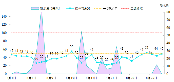 2025年8月桂林市城市环境空气质量指数(AQI指数)范围为22~55,空气质量优的天数为29天,良2天,空气质量优良天数比例为100%,与去年同期一致。2025年1—8月,桂林市空气质量优良天数比例为92.6%,同比下降5.4个百分点。