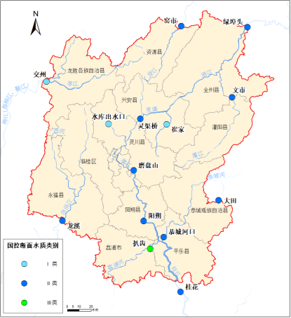 2025年8月桂林市14个地表水国控断面水质优良比例(I~Ⅲ类水质)为100%,均符合“十四五”地表水国控断面水质考核目标要求。与7月相比,扒齿断面水质类别由Ⅱ类降低为Ⅲ类,其他断面水质无变化;与2024年同期相比,崔家断面水质类别由Ⅱ类提升为Ⅰ类,大田断面水质类别由Ⅰ类降低为Ⅱ类,扒齿断面水质类别由Ⅱ类降低为Ⅲ类,其他断面水质无变化。2025年1—8月桂林市14个地表水国控断面水质优良比例(Ⅰ~Ⅲ类水质)为100%,其中I类水质断面4个,II类水质断面10个,与2024年同期相比,扒齿断面水质类别由Ⅲ类提升为II类,大田、崔家断面水质类别由Ⅱ类提升为Ⅰ类,其他断面水质无变化。桂林市国控地表水断面水质状况见表4、2025年8月桂林市国控地表水水质类别见图5。