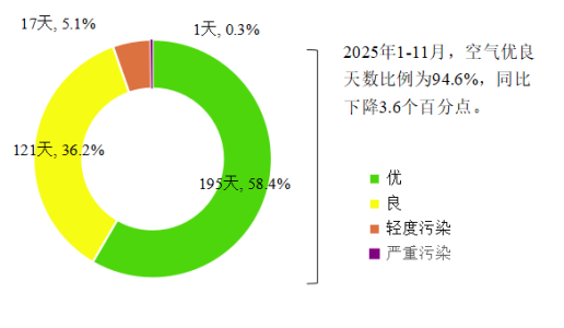 202511月,桂林市空气质量指数(AQI)范围为2470,空气质量为优18天,良12天,空气质量优良天数比例为100%,与上年同期相比持平。2025111月,桂林市空气质量优良天数比例为94.6%,同比下降3.6个百分点。
