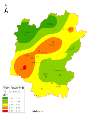 2025111月,桂林市各辖县(区、市)空气质量优良天数比例为94.6%99.7%PM2.5 平均浓度为 1930微克/立方米,综合指数为 2.013.20,空气质量由好到差排名分别为:龙胜县、资源县、恭城县、荔浦市、平乐县、灌阳县、阳朔县、兴安县、全州县、临桂区、永福县、灵川县。环境空气质量综合指数分布详见图3、图 4