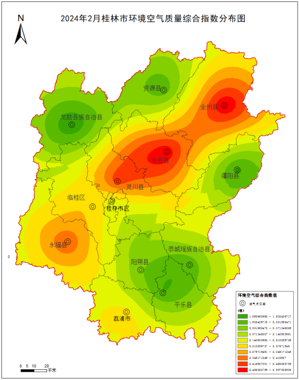 附图1 2024年2月桂林市环境空气质量综合指数分布图