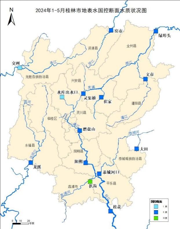 2024年1-5月桂林市14个地表水国控断面水质优良比例 ( Ⅰ~ Ⅲ类水质)为100%,均达到“十四五”地表水国控断面水质考核目标,其中Ⅰ类水质断面2个,占7.1%;Ⅱ类水质断面12个,占85.8%;Ⅲ类水质断面1个,占7.1%,各断面水质状况详见表8。