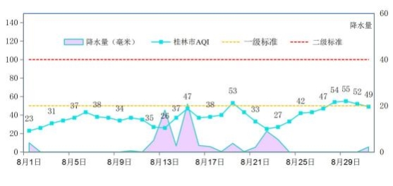 2024年8月桂林市城市环境空气质量指数(AQI指数)范围23~55,优良天数31天,其中优27天,良4天,空气质量优良天数比例为100%。2024年1-8月,桂林市空气质量优良天数比例为98.0%,与上年同期相比,上升2.1个百分点。