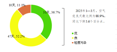 20253月桂林市城市环境空气质量指数(AQI指数)范围为26117,空气质量为优16天,良12天,轻度污染3天,轻度污染首要污染物均为臭氧;空气质量优良天数比例为90.3%,同比下降9.7个百分点。20251—3月,桂林市空气质量优良天数比例为88.9%,同比下降5.6个百分点。