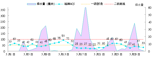 20255月桂林市城市环境空气质量指数(AQI指数)范围为2295,空气质量优的天数为18天,良13天,空气质量优良天数比例为100%,与去年同期一致。202515月,桂林市空气质量优良天数比例为88.1%,同比下降8.6个百分点。