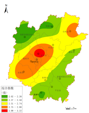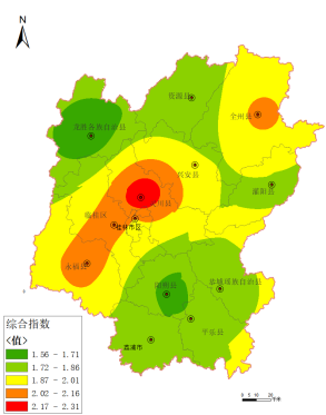 202519月,桂林市各辖县(区、市)空气质量优良天数比例为93.4%~99.6%PM2.5 平均浓度为 19~31微克/立方米,综合指数为 2.02~3.23,空气质量由好到差排名分别为:龙胜县、资源县、荔浦市、恭城县、平乐县、灌阳县、阳朔县、兴安县、全州县、临桂区、永福县、灵川县。环境空气质量综合指数分布详见图3、图 4
