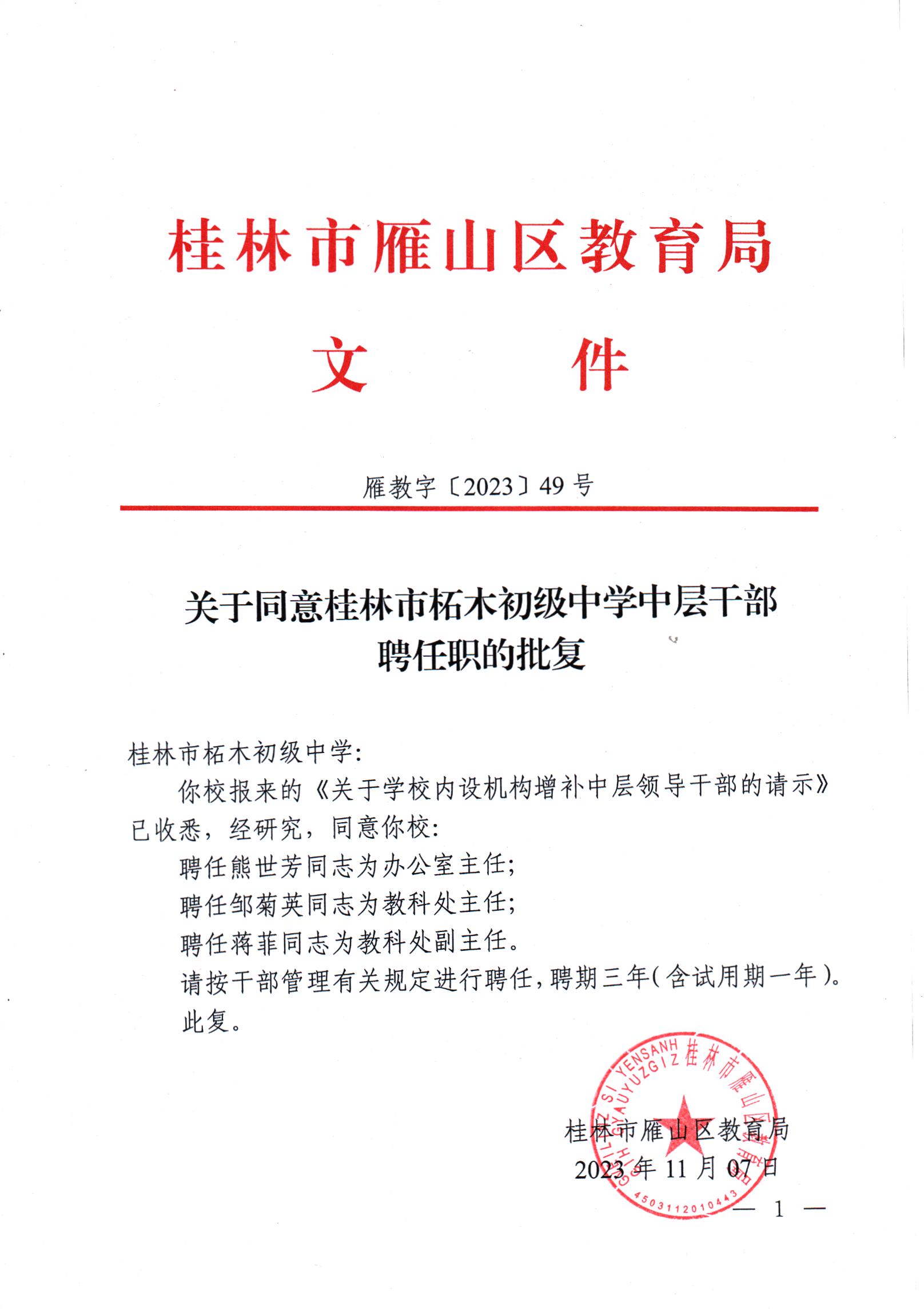 雁教字〔2023〕49号关于同意柘木初级中学中层干部聘任职的批复