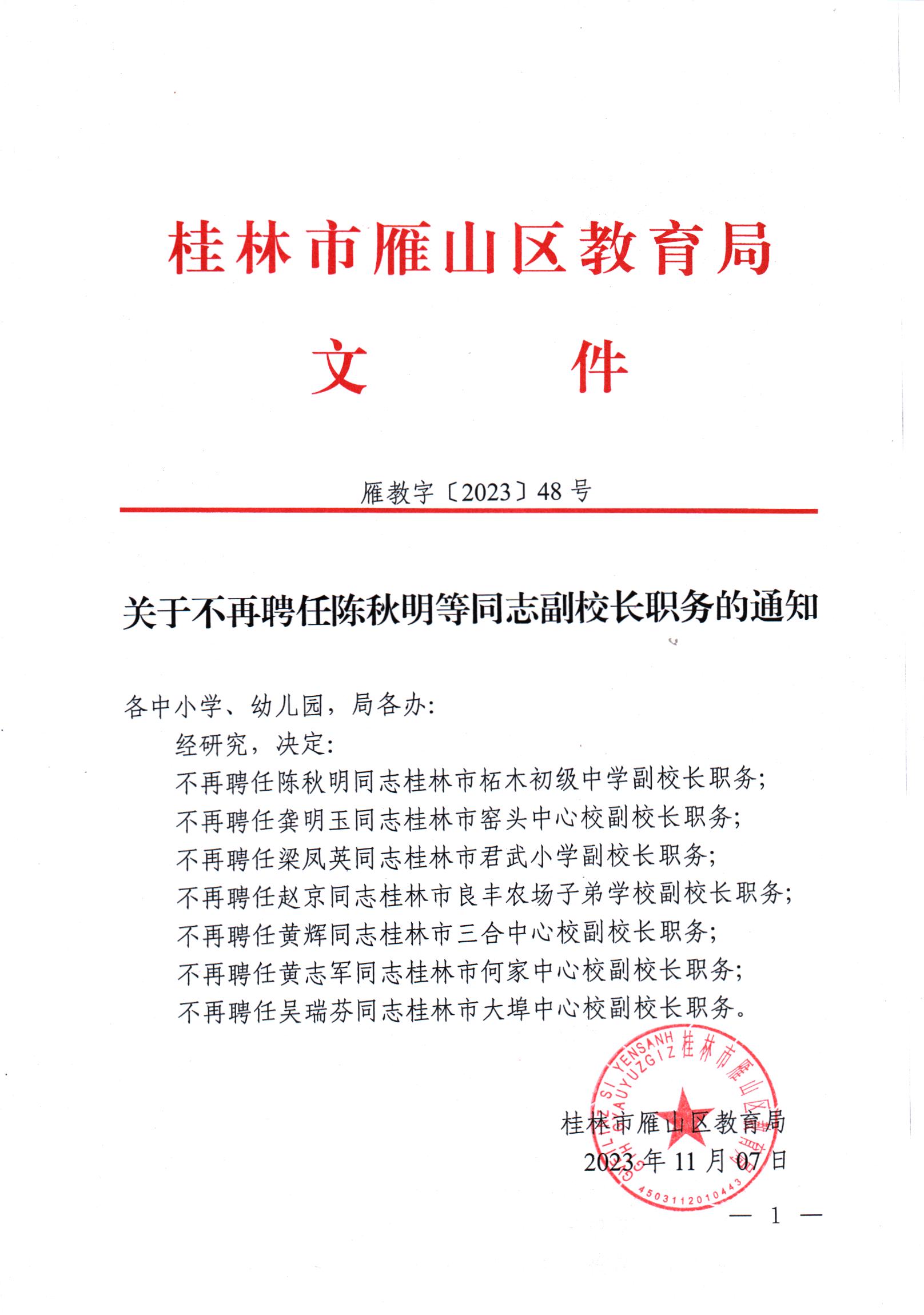 雁教字〔2023〕48号关于不再聘任陈秋明等同志副校长职务的通知