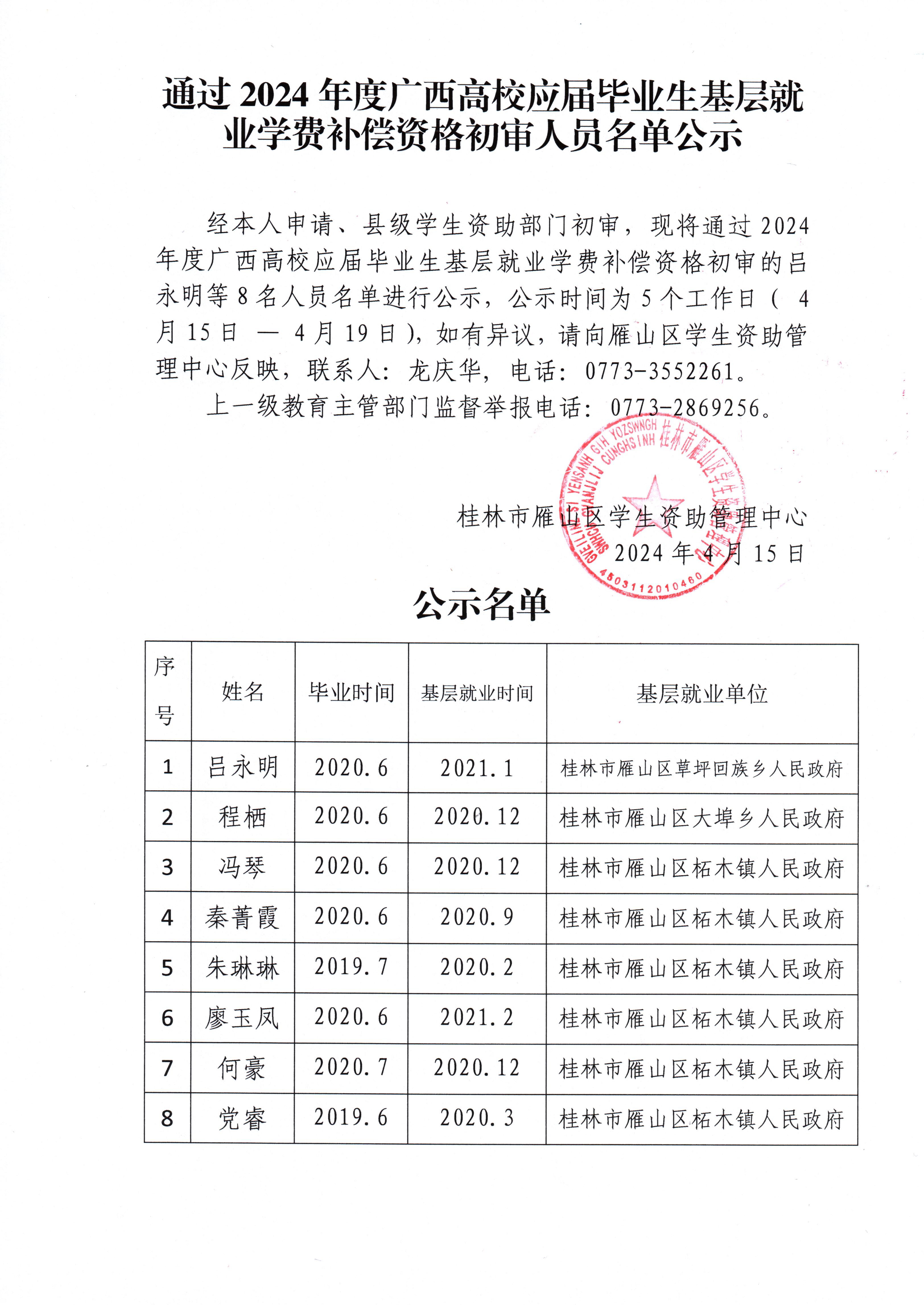 通过2024年度广西高校应届毕业生基层就业学费补偿资格初审人员名单公示