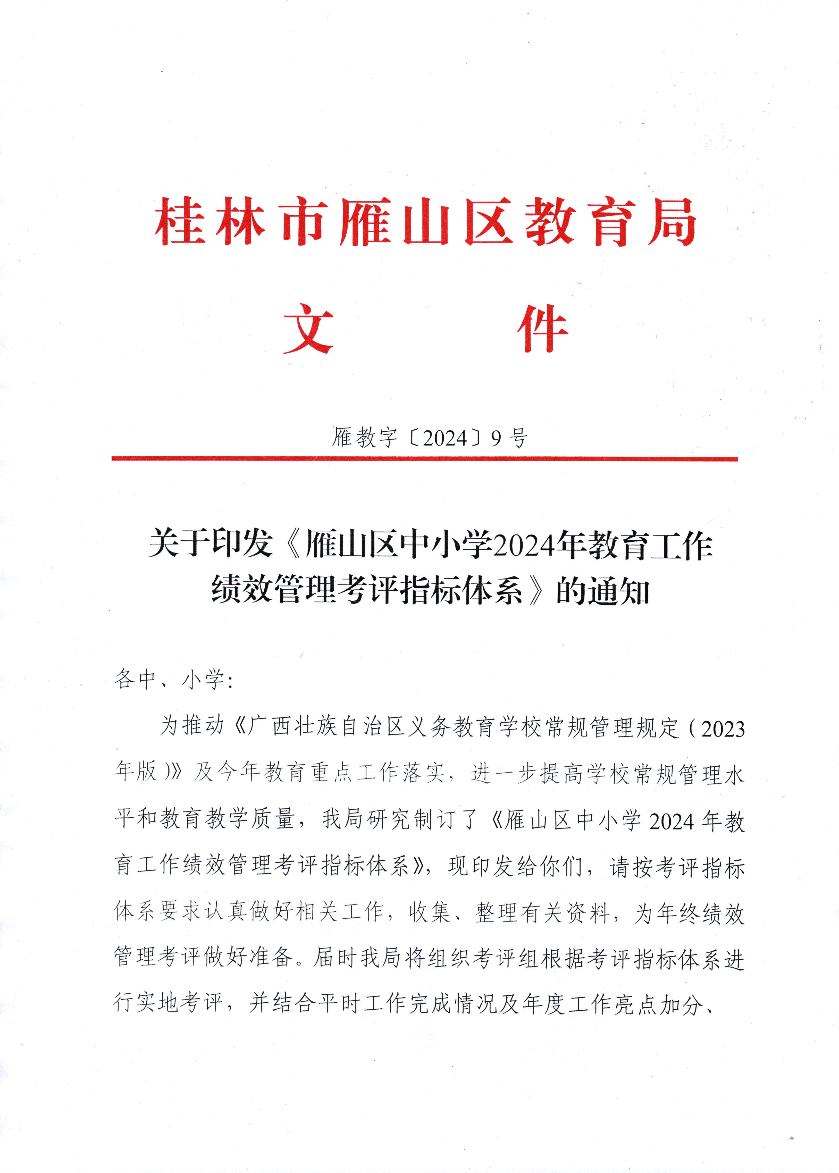 雁教字〔2024〕9号关于印发《雁山区中小学2024年教育工作绩效管理考评指标体系》的通知